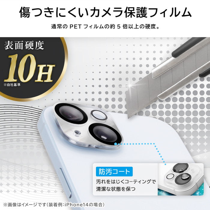 カメラにフィルムを乗せるだけの簡単貼り付け。PETフィルムの約5倍の表面硬度10Hで傷に強い。カメラを保護しながらほこりの混入を防ぐ。防汚コートで汚れをはじき清潔に保つ。