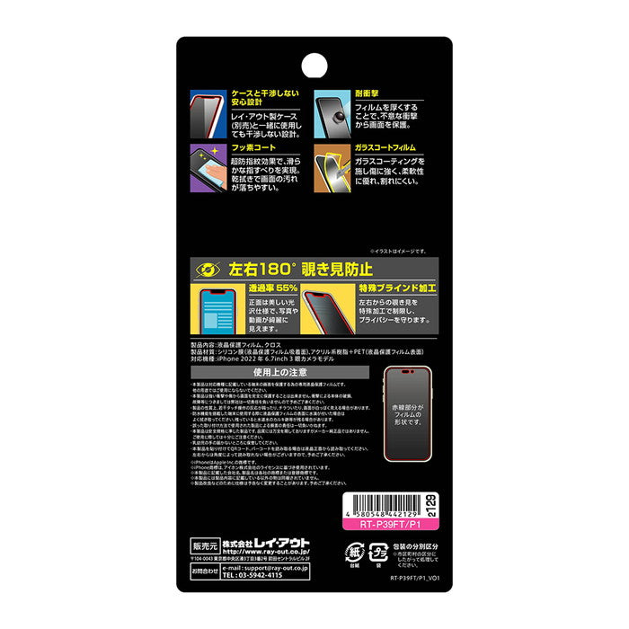 左右からの覗き見を特殊加工で制限し、プライバシーを守ります。レイ・アウト製ケース(別売)と一緒に使用しても干渉しない設計。フィルムを厚くすることで、不意な衝撃から画面を保護。超防指紋効果で、汚れの落ちやすさと滑らかな指すべりを実現。ガラスコーティングを施し、傷に強く、柔軟性に優れ、割れにくい。
