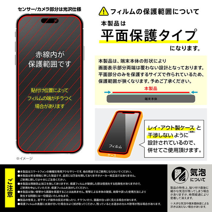 誰でも簡単に貼り付けができる貼り付けキット付きで失敗しない。PETフィルムの約5倍の硬度で傷付きにくい。太陽光や照明の反射を防ぐので画面が見やすい。防汚コーティングで指紋防止効果。レイ・アウト製ケース(別売)と一緒に使用しても干渉しない設計。